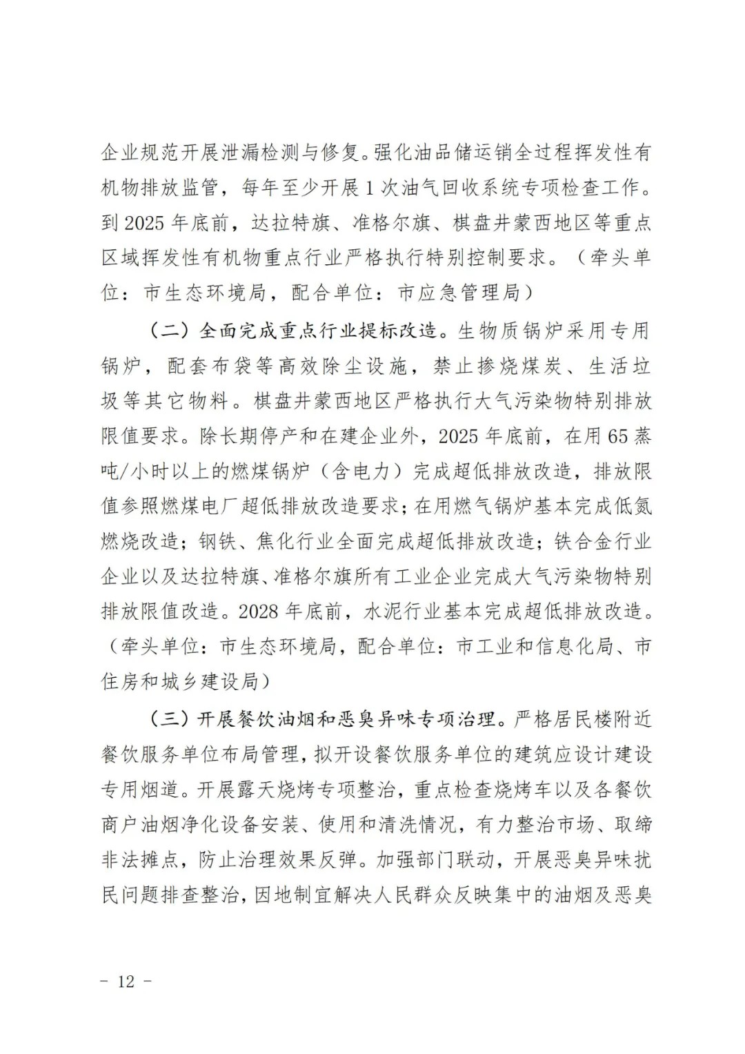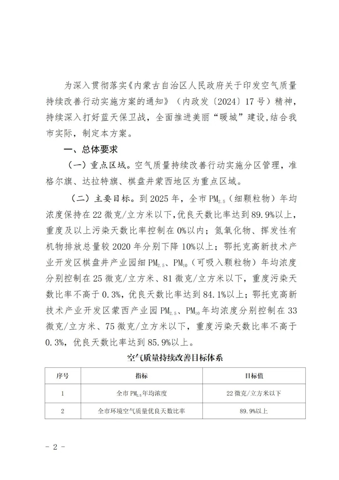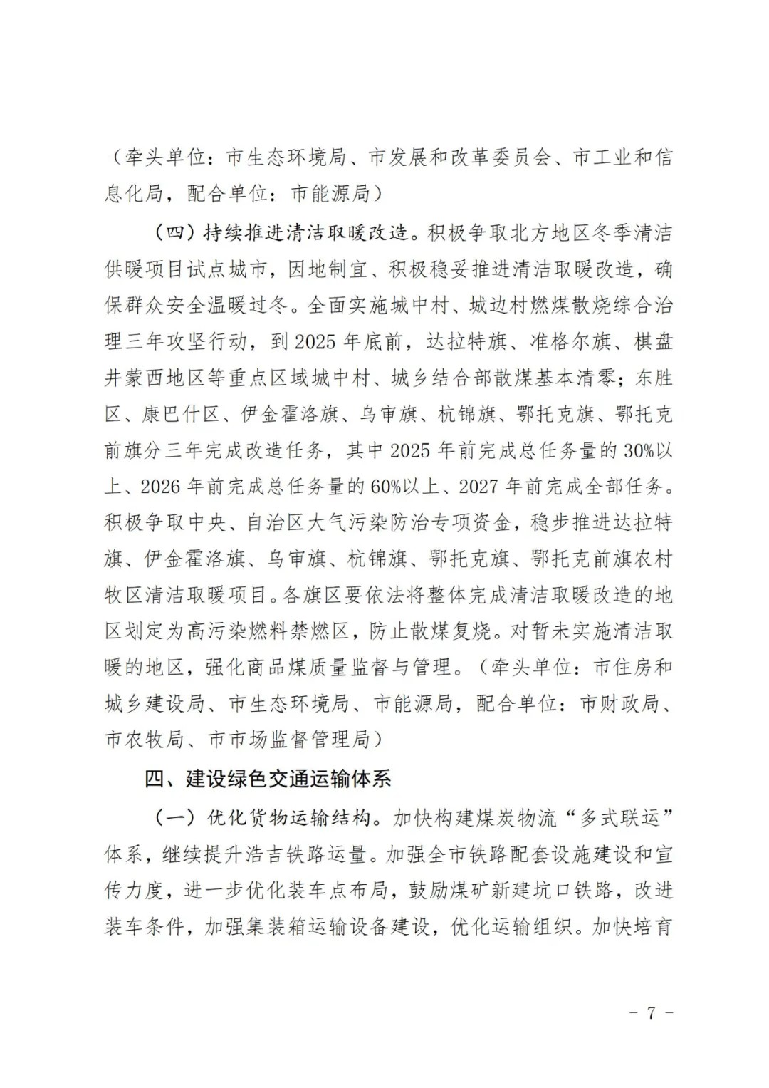 方案强调,持续推进清洁取暖改造。积极争取北方地区冬季清洁供暖项目试点城市,因地制宜、积极稳妥推进清洁取暖改造,确保群众安全温暖过冬。全面实施城中村、城边村燃煤散烧综合治理三年攻坚行动,到2025年底前,达拉特旗、准格尔旗、棋盘井蒙西地区等重点区域城中村、城乡结合部散煤基本清零;东胜区、康巴什区、伊金霍洛旗、乌审旗、杭锦旗、鄂托克旗、鄂托克前旗分三年完成改造任务,其中2025年前完成总任务量的30%以上、2026年前完成总任务量的60%以上、2027年前完成全部任务。积极争取中央、自治区大气污染防治专项资金,稳步推进达拉特旗、伊金霍洛旗、乌审旗、杭锦旗、鄂托克旗、鄂托克前旗农村牧区清洁取暖项目。各旗区要依法将整体完成清洁取暖改造的地区划定为高污染燃料禁燃区,防止散煤复烧。对暂未实施清洁取暖的地区,强化商品煤质量监督与管理。