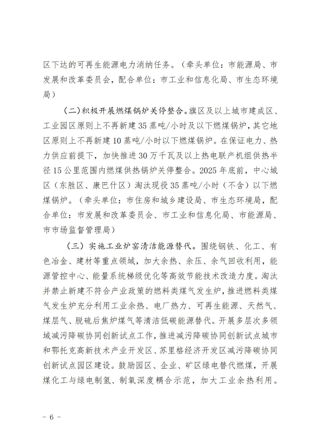 日前,鄂尔多斯市人民政府发布《鄂尔多斯市人民政府关于印发空气质量持续改善行动实施方案的通知》。根据通知内容显示,要积极开展燃煤锅炉关停整合。旗区及以上城市建成区、工业园区原则上不再新建35蒸吨/小时及以下燃煤锅炉,其它地区原则上不再新建10蒸吨/小时以下燃煤锅炉。在保证电力、热力供应前提下,加快推进30万千瓦及以上热电联产机组供热半径15公里范围内燃煤供热锅炉关停整合。2025年底前,中心城区(东胜区、康巴什区)淘汰现役35蒸吨/小时(不含)以下燃煤锅炉。