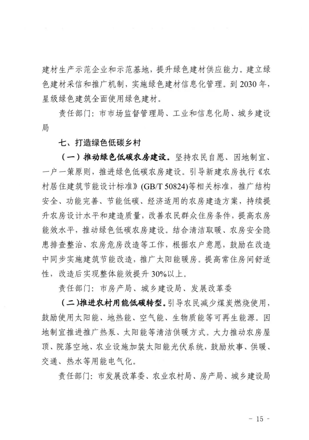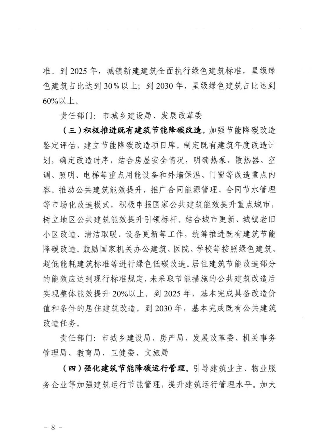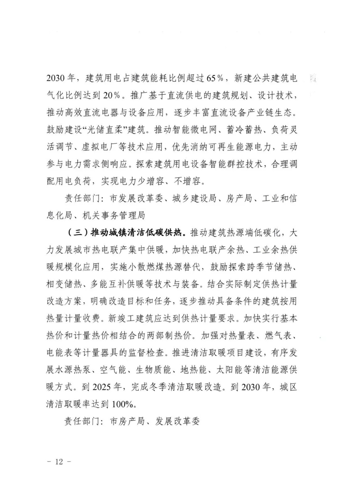 再次,要推动城镇清洁低碳供热。推动建筑热源端低碳化,大力发展城市热电联产集中供暖,加快热电联产余热、工业余热供暖规模化应用,实施小散燃煤热源替代,鼓励探索跨季节储热、相变储热、多能互补供暖等技术与装备。结合实际制定供热计量改造方案,明确改造目标和任务,逐步推动具备条件的建筑按用热量计量收费。新竣工建筑应达到供热计量要求。加快实行基本热价和计量热价相结合的两部制热价。加强对热量表、燃气表、电能表等计量器具的监督检查。推进清洁取暖项目建设,有序发展水源热泵、空气能、生物质能、地热能、太阳能等清洁能源供暖方式。到2025年,完成冬季清洁取暖改造。到2030年,城区清洁取暖率达到100%。