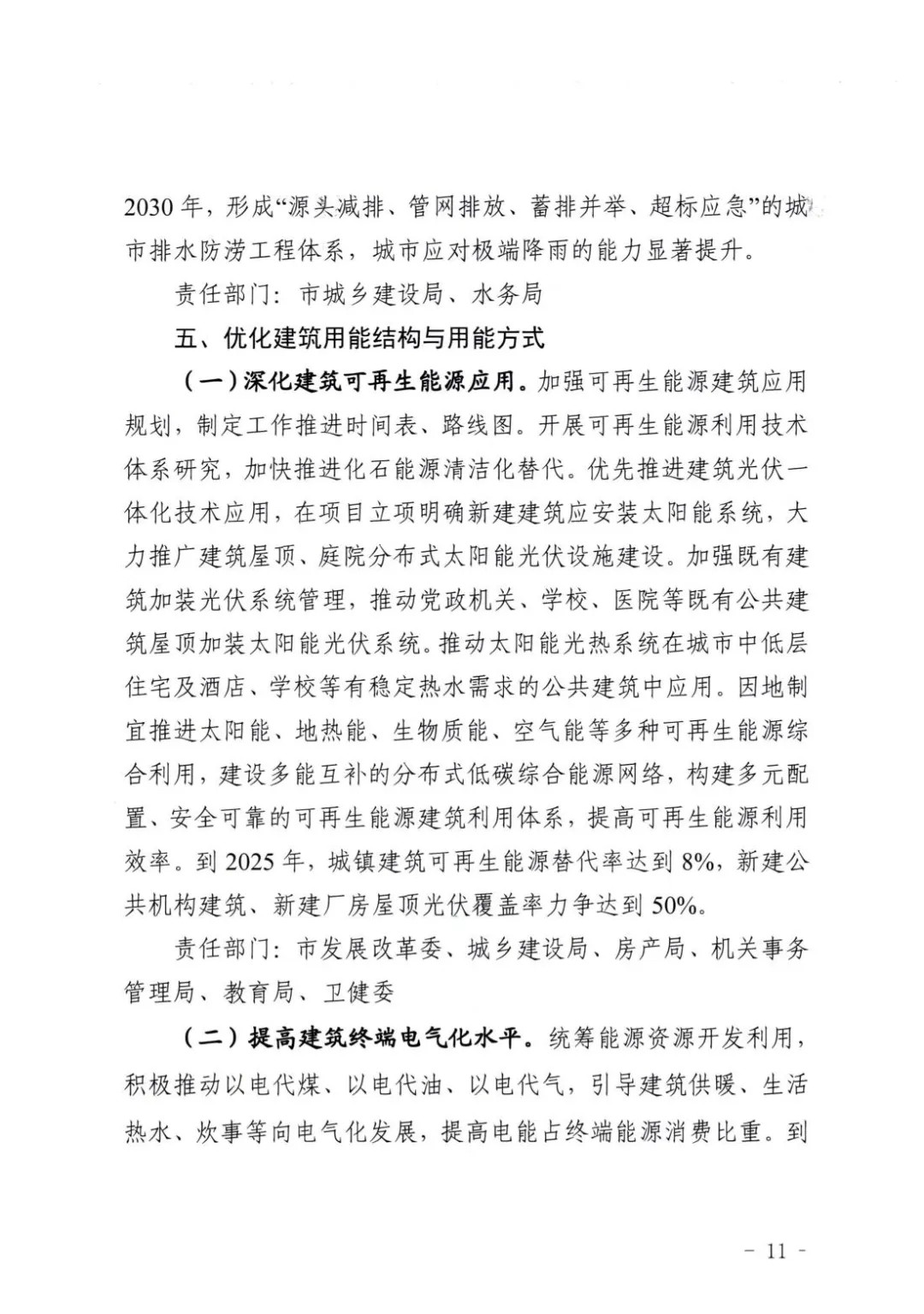 其次,要提高建筑终端电气化水平。统筹能源资源开发利用,积极推动以电代煤、以电代油、以电代气,引导建筑供暖、生活热水、炊事等向电气化发展,提高电能占终端能源消费比重。到2030年,建筑用电占建筑能耗比例超过65%,新建公共建筑电强气化比例达到20%。推广基于直流供电的建筑规划、设计技术,推动高效直流电器与设备应用,逐步丰富直流设备产业链生态。鼓励建设“光储直柔”建筑。推动智能微电网、蓄冷蓄热、负荷灵活调节、虚拟电厂等技术应用,优先消纳可再生能源电力,主动参与电力需求侧响应。探索建筑用电设备智能群控技术,合理调配用电负荷,实现电力少增容、不增容。