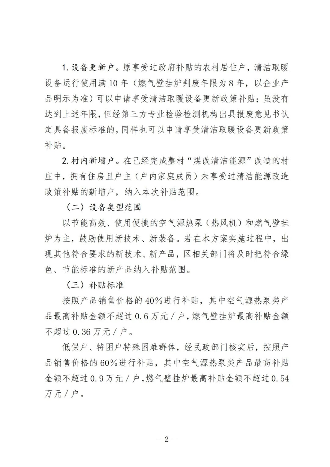 低保户、特困户特殊困难群体,经民政部门核实后,按照产品销售价格的60%进行补贴,其中空气源热泵类产品最高补贴金额不超过0.9万元/户,燃气壁挂炉最高补贴金额不超过0.54万元/户。